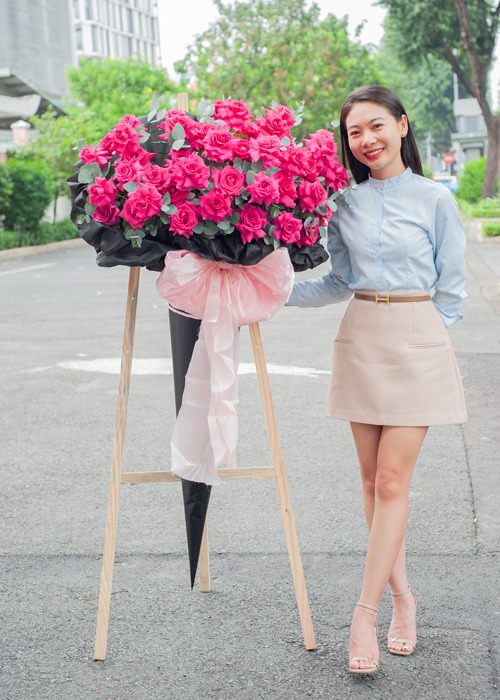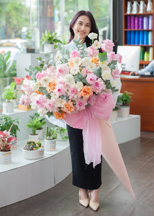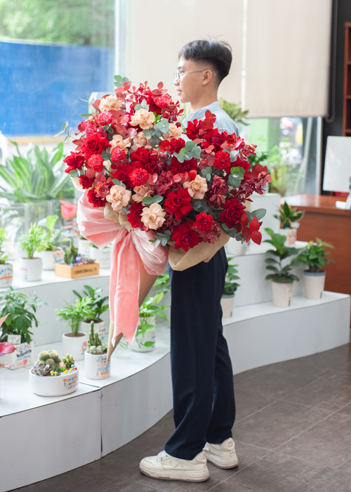 Đối với những bó hoa khổng lồ và ấn tượng, một số đơn vị như Hoa Yêu Thương còn cung cấp kèm theo kệ gỗ chưng bày chuyên dụng, giúp tác phẩm trở nên vững chãi và thêm phần sang trọng.
