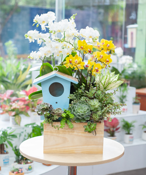 Chậu gồm 3 gốc lan mini trắng và 2 gốc lan mini vàng (2 vòi) và các loại sen đá mix. Sản phẩm hiện cung cấp tại Tp.HCM
