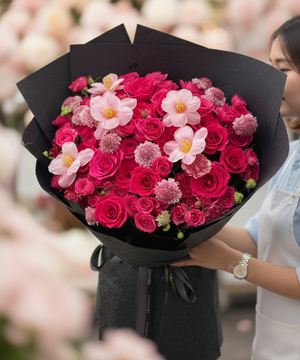 Lunar Pearl là bó hoa hồng Pink Floyd rực rỡ trong nền giấy gói đen sang trọng, tạo hiệu ứng “glow” nổi bật như ánh sao giữa bầu trời đêm. Sắc hồng được cân bằng bởi những cành scabiosa mềm mại và điểm xuyết thêm những cành tulip hồng pastel nổi bật tạo cảm giác hiện đại, kiêu kỳ nhưng vẫn tinh tế—phù hợp mọi dịp chúc mừng, sinh nhật, kỷ niệm hay tỏ tình. Bó hoa có 2 phiên bản cho bạn lựa chọn: 1 là phiên bản dùng hồng Pink Floyd nhập khẩu (bông to), 2 là phiên bản dùng hồng Pink Floyd của Đà Lạt (bông nhỏ 1/2 so với hoa nhập). Để bảo đảm thành phẩm đúng ý, Quý khách vui lòng chọn đúng phiên bản.