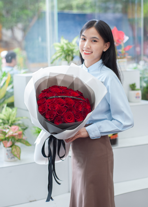 Bó hoa hồng đỏ cổ điển được thiết kế tối giản mà đầy cuốn hút tượng trưng cho tình yêu nồng cháy. Tông đỏ quyền lực được làm nổi bật trên nền giấy gói đen – trắng sang trọng, mang đến cảm giác vừa hiện đại vừa tinh tế. Mỗi đóa hoa như một lời khẳng định mạnh mẽ của cảm xúc, phù hợp để dành tặng trong các dịp kỷ niệm tình yêu, Valentine, sinh nhật người thương hay những khoảnh khắc cần bày tỏ trọn vẹn tấm lòng.