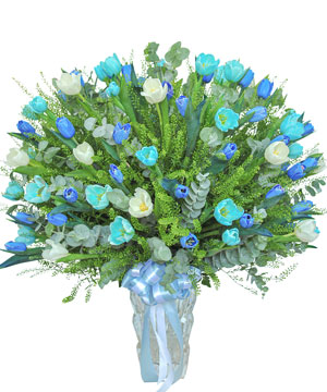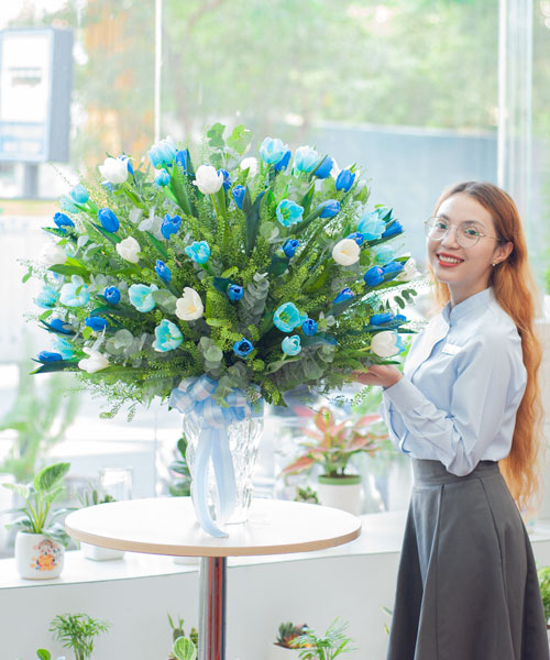 Bình hoa Tulip phảng phất sự tươi mát và tinh khiết với sắc xanh dương đậm và nhạt điểm xuyết bởi sắc trắng nhẹ nhàng. Sự kết hợp màu sắc này thường liên tưởng đến sự bình yên, tinh tế và sáng tạo. Bình hoa cao cấp này thích hợp để tặng cho những người Sếp, hoặc bạn bè mà bạn muốn gửi gắm sự quý mến và tôn trọng sâu sắc. Mẫu hoa này cũng rất phù hợp để tặng trong các dịp như khai trương, chúc mừng thành công mới, hoặc tặng cho đối tác kinh doanh như một lời chúc thịnh vượng.