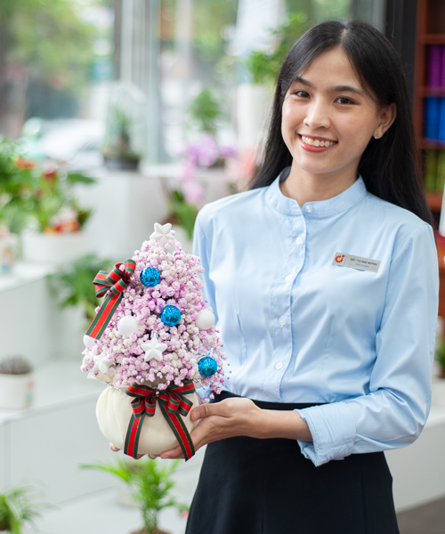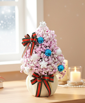 Được làm hoa baby nhập khẩu, cây thông này được thợ cắm tỉ mỉ vào foam xốp có nước, giúp giữ độ tươi lâu dài. Với sự kết hợp tinh tế giữa những cành baby hồng dễ thương và các phụ kiện trang trí như bóng đèn, quả châu, ruy băng, cây thông mang đến vẻ đẹp độc đáo tăng thêm màu sắc rực rỡ cho mùa lễ hội này.