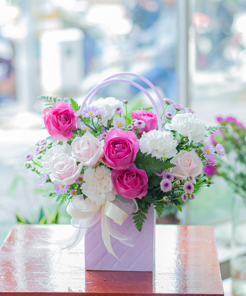 Giỏ hoa với sự kết hợp hài hòa giữa hoa hồng candy nổi bật và cẩm chướng trắng, thể hiện một vẻ đẹp mạnh mẽ, sâu sắc và ấn tượng. Sắc hồng đậm của hoa hồng tượng trưng cho tình yêu nồng nàn, sự say đắm và lòng trung thành. Màu trắng của hoa cẩm chướng lại mang đến sự cân bằng, tượng trưng cho sự tinh khiết và lòng chân thành. Giỏ hoa này không chỉ là một món quà ý nghĩa mà còn là biểu tượng của sự gắn kết, tình yêu bền chặt và tình cảm chân thành