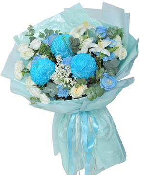 Sự kết hợp xanh – trắng thanh thoát, hiện đại gợi hình ảnh bầu trời rộng mở vô tận. Bó hoa là lời nhắn gửi về tự do, niềm tin và những khát vọng bay cao. Infinite Sky mang ý nghĩa của hy vọng không giới hạn, hướng đến tương lai đầy tươi sáng và bình yên.