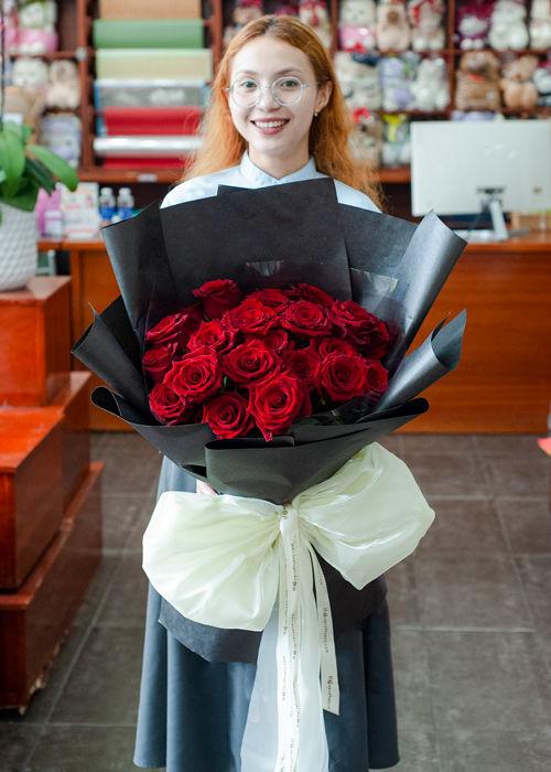 Bó hoa "Eternal Flame" được tạo nên từ những bông hồng có cánh lớn và màu đỏ thuần khiết nhất, tượng trưng cho một ngọn lửa tình yêu vĩnh cửu, không bao giờ lụi tàn. Sự đầu tư xứng đáng cho một tình yêu bất tử.