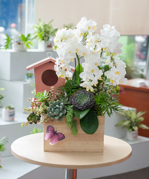 Chậu gồm 3 gốc lan mini trắng (2 vòi) và các loại sen đá mix. Sản phẩm hiện cung cấp tại Tp.HCM