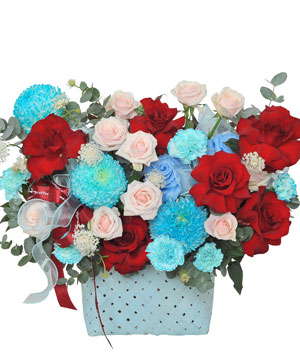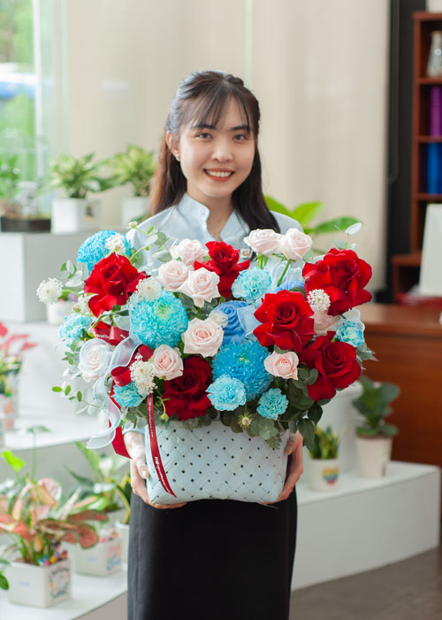 Sắc đỏ thắm của hồng ecuador là biểu tượng của niềm đam mê, ý chí bền bỉ và khát vọng được sống trọn vẹn. Xen giữa là sắc xanh dương của cẩm chướng, cúc mẫu đơn, như lời nhắn về sự bình an và niềm tin vững vàng trong tâm hồn. Những đóa hồng pastel lại nhẹ nhàng cân bằng tất cả, gợi lên sự thuần khiết và hy vọng mỏng manh nhưng bền bỉ.