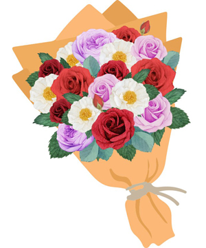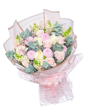 Bao gồm 10 cành hoa hồng các màu theo chủ đề, 3 hoa phụ như cát tường, cẩm chướng, cúc, lan... nhiều loại lá và phụ kiện khác.