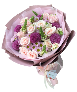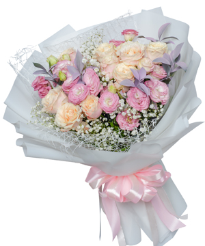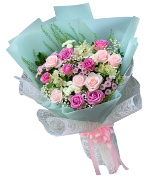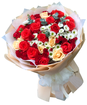 Bao gồm 10 cành hoa hồng các màu theo chủ đề, 5 hoa phụ như cát tường, cẩm chướng, cúc, lan... nhiều loại lá và phụ kiện khác.