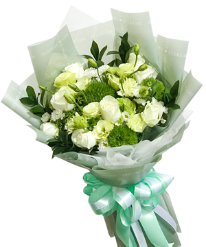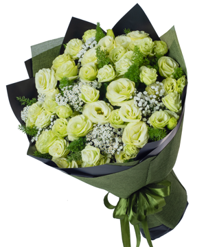 Bao gồm 10 cành hoa hồng các màu theo chủ đề, 5 hoa phụ như cát tường, cẩm chướng, cúc, lan... nhiều loại lá và phụ kiện khác.