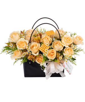 Bao gồm 10 cành hoa hồng các màu theo chủ đề, 3 hoa phụ như cát tường, cẩm chướng, cúc, lan... nhiều loại lá và phụ kiện khác.