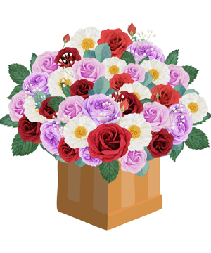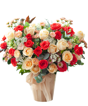 Bao gồm 25 cành hoa hồng các màu theo chủ đề, 5 hoa phụ như cát tường, cẩm chướng, cúc, lan... nhiều loại lá và phụ kiện khác.