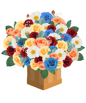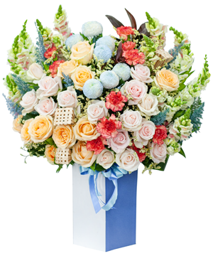 Bao gồm 30 cành hoa hồng các màu theo chủ đề, 5 hoa phụ như cát tường, cẩm chướng, cúc, lan... nhiều loại lá và phụ kiện khác.