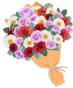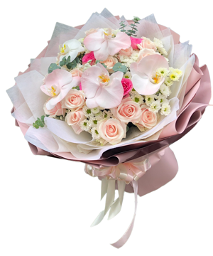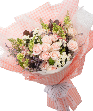 Bao gồm 25 cành hoa hồng các màu theo chủ đề, 5 hoa phụ như cát tường, cẩm chướng, cúc, lan... nhiều loại lá và phụ kiện khác.
