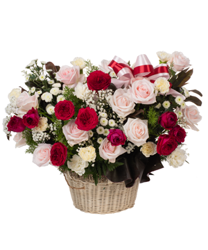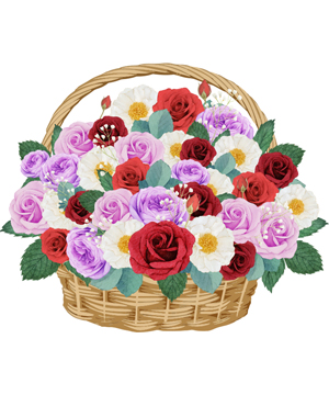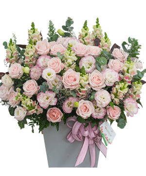 Sẽ bao gồm 25 cành hoa hồng các màu theo chủ đề và hoa 5 phụ như cát tường, cẩm chướng, cúc, lan... và nhiều loại lá và phụ kiện khác.