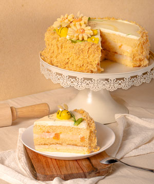 Thành phần: Cốt bánh bông lan, có sốt bơ trứng ở bề mặt bánh. Phía trên phủ chà bông và trứng muối