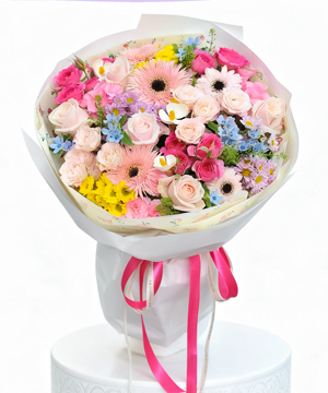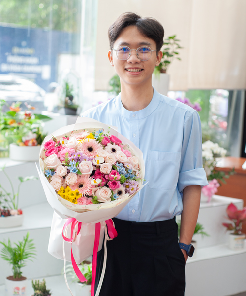 Bó hoa được thiết kế theo đúng tinh thần Garden Style – phong cách khu vườn tự nhiên với những đường nét phóng khoáng, mềm mại và tầng lớp hoa đan xen đầy cảm hứng. Sự kết hợp đa dạng nhiều loại hoa tạo nên tổng thể đa màu sắc nhưng vẫn hài hòa, hiện đại và đầy sức sống.